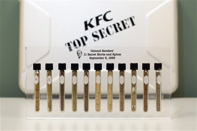 數(shù)十年來(lái),外界只知道肯德基的炸雞食譜是由十一種草藥與香料調(diào)配而成,但究竟是哪十一種草藥與香料,比例、成份又是多少,從來(lái)無(wú)法進(jìn)一步得知。為了保護(hù)食譜內(nèi)容不曝光,肯德雞數(shù)十年來(lái)都是分別向不同的食材供貨商購(gòu)買材料,因此供貨商也不知道完整的食譜成份。