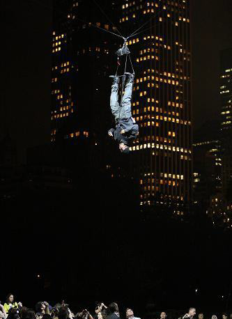表演結束之后,戴維布萊恩再送給魔術迷另一個表演,他從十三點四公尺高的金屬架頂向下墜落,短暫擺蕩后又急速往上升,接著就消失在公園上方的夜空中。