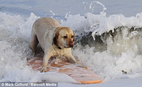 這只三歲的拉布拉多犬能夠駕著沖浪板在海浪中保持身體平衡,這對一只狗來說很難做到。小狗的主人是一對父子,他們也是沖浪愛好者。據(jù)父親介紹說,這只狗從生下來就開始和他們一起下水玩耍了。