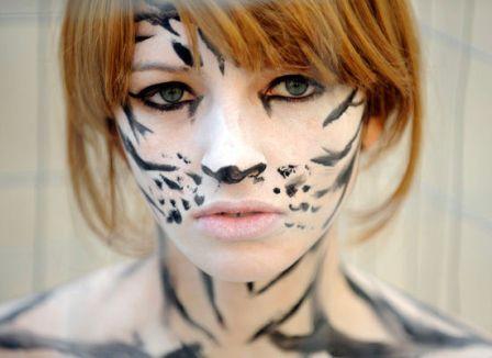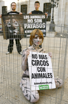 該女子身上涂滿(mǎn)了彩繪,把自己關(guān)在一個(gè)籠子里,手持“不要再和動(dòng)物耍花招”的標(biāo)語(yǔ)。