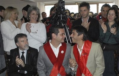 本月初,在首都布宜諾斯艾利斯結婚的計劃遭到拒絕后,同性戀權利活動家阿歷克斯•弗里爾(Alex Freyre)和何塞瑪麗亞•狄貝洛(Jose Maria Di Bello)于28日在火地島首府烏斯懷亞,在朋友和官員的見證下舉行了婚禮。
