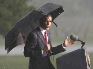 5月31日下午,奧巴馬準備在林肯國家公墓發表國殤日演說,正當他站上講臺之際,天空中忽然下起大雨,一時間雷電交加,風也狂吹,一旁的旗幟不停左右搖擺。由于雷雨越下越大,完全沒有趨緩,奧巴馬撐著一把大黑傘,宣布演說暫時取消。