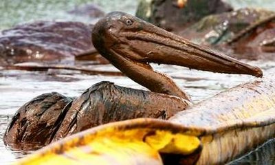 其中一幀照片顯示一只鵜鶘在油污中掙扎,呼吸困難,原油從它的羽毛上滴下,情景好像恐怖科幻片。這張照片充分反映了漏油事故對野生動物的災難性影響。
