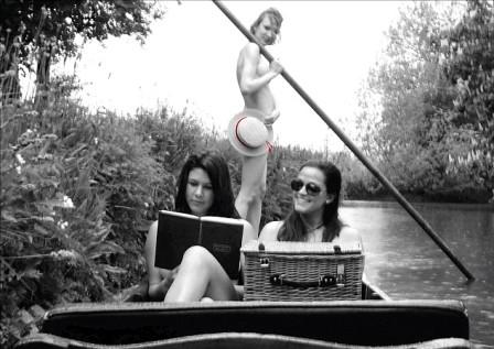 在7月號的掛歷上,是3名女學生早晨在法國中部的謝爾河里一絲不掛地劃船。