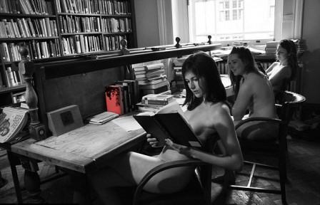 8月號的掛歷上,則是一組女學生在圖書館中讀書,她們巧用書本遮蓋自己的隱私處。