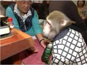 日本小店找來猴子當起服務生送酒,受到顧客歡迎。
