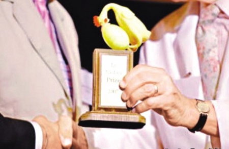 據悉,搞笑諾貝爾獎(Ig Nobel)每年搶在諾貝爾獎公布前一至兩周頒發。其主辦單位為《不可能的研究記錄》(Annals of Improbable Research),名稱則源自諾貝爾相似字noble(高貴的)的反義詞“ignoble”(卑賤的,不光彩的),連取名都不忘幽本尊一默。