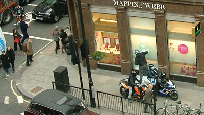 中新網(wǎng)3月10日電 據(jù)外電9日報(bào)道,五名騎摩托車的“劫匪”停在珠寶商店門前,用大錘砸碎商店櫥窗,在眾目睽睽之下?lián)屪邇r(jià)值5萬英鎊的珠寶。這一驚人的場景日前就發(fā)生在英國倫敦著名的“珠寶一條街”上。