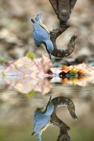 中新網3月23日電 據英國《每日郵報》22日報道,一名英國攝影師在自己建造的掩體下呆了一個月,只為了拍攝雀鳥臨水嬉戲的照片。功夫不負有心人,他拍到了一只五子雀(Nuthatch)水中照影自憐的完美照片,十分有趣。
