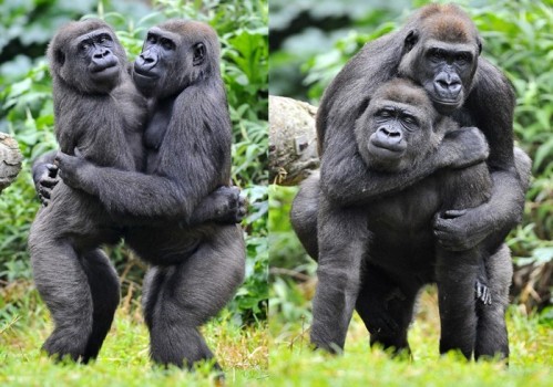在猩猩的禮節(jié)中,似乎握手不是很受歡迎的動(dòng)作,擁抱才能表達(dá)它們的感情。初次見面時(shí),猩猩會(huì)在地上快速旋轉(zhuǎn),來表達(dá)對(duì)同伴的問候。母猩猩還會(huì)迅速做出一些復(fù)雜的動(dòng)作。