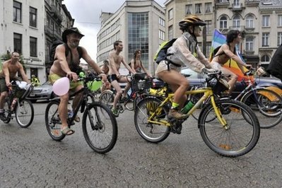 據報道,大約50名沒穿褲子、赤身裸體的比利時人在首都布魯塞爾市組成隊伍,騎著自行車游行。雖然當天風雨交加,“勇士”們的熱情卻沒有輕易被澆滅。