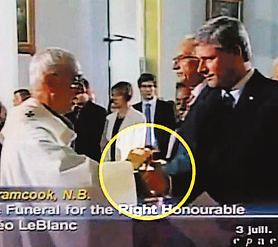 據香港文匯報報道,哈珀上周出席加拿大前總督勒布朗的天主教葬禮,流傳在YouTube上的電視畫面顯示:哈珀領了圣餐(見圖),但鏡頭停留的數秒鐘中,都沒有哈珀把圣餐餅放入嘴中的動作。
