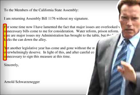然而,施瓦辛格的過(guò)人“幽默感”與反擊方式不僅止步于此。他在否決這項(xiàng)法案的特別咨文中,竟以“藏頭詩(shī)”的方式狠狠羞辱了政敵阿米阿諾。從信的正文第二自然段起,將每行左邊第一個(gè)字母挑出來(lái),豎著念,就能拼成兩個(gè)單詞,而這兩個(gè)單詞可謂是全球最廣為人知、也堪稱(chēng)美國(guó)“國(guó)罵”的不雅詞匯。可見(jiàn)這位曾經(jīng)對(duì)著萬(wàn)千觀眾大秀肌肉的好萊塢猛男玩起文字游戲來(lái),一點(diǎn)也不含糊。