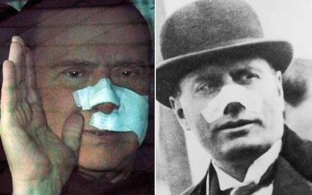 出院時,只見貝氏鼻子和左臉都包著白紗布,有人指出他的這一形象與80多年前,意大利法西斯獨裁頭子墨索里尼遇襲的形象十分相似。據悉,1926年,一名憤怒的愛爾蘭貴族在一次會議上槍擊了墨索里尼,子彈恰恰擦中了墨索里尼的鼻子。與貝盧斯科尼一樣,墨索里尼當年遇襲時同樣是意大利總理、同樣是臉部受傷,照片顯示二人連包扎傷口的位置都幾乎相同,不禁讓人感嘆歷史奇妙的巧合。