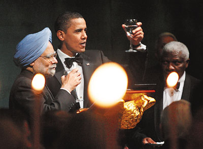 中新網11月26日電 據香港《文匯報》報道,美國總統奧巴馬24日晚在白宮南草坪首設國宴,高規格接待正在華盛頓進行國事訪問的印度總理辛格,這是奧巴馬上任后第一次以國宴規格款待來賓,從環境布置到菜譜,處處顯出印度特色,凸顯美國對南亞伙伴的高度重視,但在失業率高企之際舉行盛宴亦受到抨擊。