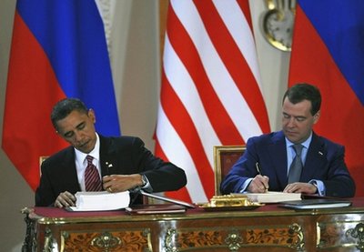 中新網4月8日電 綜合媒體報道,俄羅斯總統梅德韋杰夫與美國總統奧巴馬于當地時間4月8日中午在捷克首都布拉格簽署了兩國關于削減進攻性戰略武器的新條約。