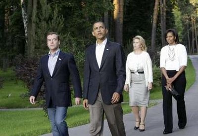 7月6日,俄羅斯總統梅德韋杰夫在莫斯科與到訪的美國總統奧巴馬舉行會談。奧巴馬當日抵達莫斯科進行為期三天的訪問,這是他就任總統以來首次訪問俄羅斯。
