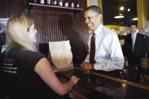 據(jù)法新社消息,美國(guó)總統(tǒng)奧巴馬13日在紐約州布法羅時(shí),突然造訪當(dāng)?shù)匾患乙猿鍪邸八3抢彪u翅”而聞名的小吃店。一名女店員由于見(jiàn)到奧巴馬過(guò)度緊張和興奮,竟一時(shí)口誤,用了極其不雅的詞匯稱(chēng)贊奧巴馬是“帥哥”。