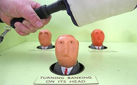 據英國《每日電訊報》12月13日報道,經濟衰退下,英國近日流行一種“敲銀行家”(Whack a banker)的游戲,玩家只需支付40便士(約合人民幣4.5元),就可以在銀行家彈出時重擊他們,為自己出氣。