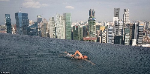 報道稱,建在樓頂?shù)挠境乜雌饋砣缤嫜由斓降仄骄一般壯觀。你可以一邊游泳,一邊俯瞰新加坡靚麗的城市風光。從泳池溢出的水會滲入到特別設(shè)計的集水區(qū),并通過水泵和水處理系統(tǒng)重新回到泳池中。