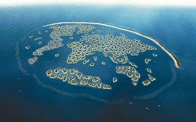 “世界島”是世界上最大的人造海島,用300個(gè)形狀模仿世界各大洲的人工島嶼,組成一個(gè)微縮版地球,每個(gè)島嶼的面積從2300平方米到8360平方米不等。島上設(shè)有酒店以及各種休閑旅游設(shè)施。4座人工島在太空都清晰可見(jiàn),堪稱現(xiàn)代“世界第八大奇跡”。
