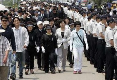 中新網(wǎng)5月26日電 韓國慶尚南道金海市峰下村25日的白天最高氣溫達到了30度,當(dāng)天是韓國前總統(tǒng)盧武鉉逝世的第三天。從村子入口通往盧武鉉靈堂的兩公里長雙向2車道公路上,沒有一點兒背陰處。由于警方在村口阻止車輛進入,市民們只能頭頂報紙、手帕、草帽,在往返需要一小時的炎熱的柏油路上步行前往焚香所。很多人即使汗如雨下也沒有脫掉黑色的西服上衣。