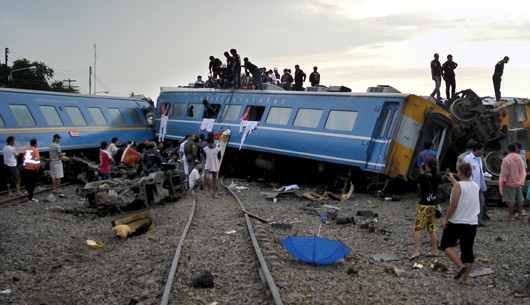 這列火車從泰國南部Trang省開往曼谷,在距離海邊度假地Hua Hin南部13公里處脫軌。據(jù)警方介紹,有7人當(dāng)場死亡,另外有45人被送往附近兩個醫(yī)院。泰國媒體報道稱,有100多人受傷。