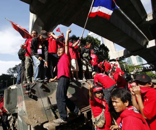“紅衫軍”去年四月十二日在曼谷發起示威,軍方一輛裝甲車被示威者拿下。(資料圖片)