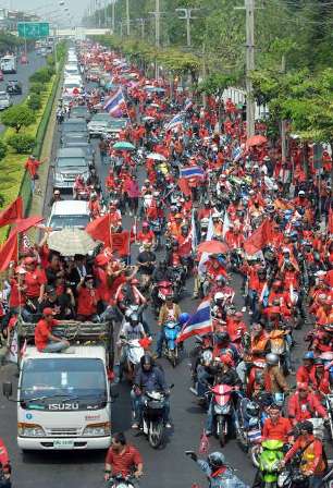 紅衫軍聲稱,屆時將有多達100萬支持者將匯聚到曼谷街頭,要求阿披實解散國會,重新大選。而泰國政府預計,聚集的紅衫軍人數只有10萬。