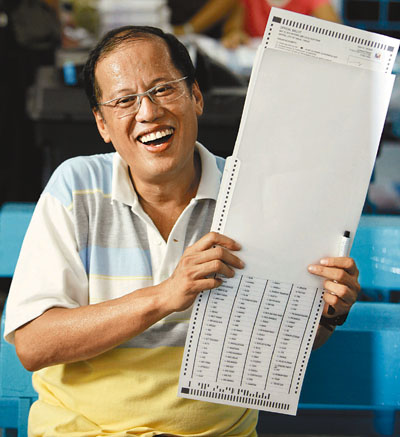 中新網5月11日電 據香港《文匯報》報道,菲律賓10日大選,選舉委員會表示,在已點算的57%選票中,已故前總統阿基諾夫人的兒子阿基諾三世取得40.58%選票,其勁敵73歲前總統埃斯特拉達只得25.72%。阿基諾三世有望繼亡母后,成為家族中第2名總統,他承諾當選后致力打擊腐敗和消除貧困。