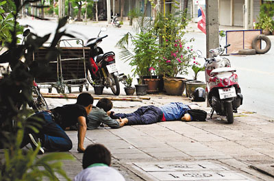 中新網(wǎng)5月16日電 據(jù)香港《文匯報(bào)》報(bào)道,曼谷街頭腥風(fēng)血雨,來(lái)自泰北的33歲示威者塞達(dá)15日留守紅衫軍陣地,站在用竹枝、車(chē)胎和有刺鐵絲網(wǎng)搭成的護(hù)欄旁把守,緊張地測(cè)試手上的彈弓,想到剛有19人死了,他說(shuō):“我不知道接下來(lái)會(huì)如何,我害怕,但沒(méi)選擇,我們?nèi)己ε聲?huì)死。”