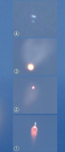 韓國最大的國營電視臺KBS拍到的畫面顯示:①圖升至距地面70公里高空的“羅老”號的火焰開始是紅色的,②圖接著火焰變大,呈現(xiàn)類似爆炸后的景象,③火焰越變越大,并向下掉落。④火焰消失后,被推測認(rèn)為是“羅老”號的白色物體開始向下墜落。