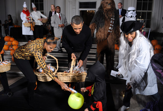 雖然奧巴馬與夫人米歇爾沒有特殊打扮,但親自向小客人分發糖果。兩人稍后還與副總統拜登夫婦接見軍人及白宮職員家眷,共度萬圣節。
