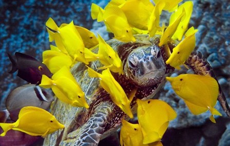 在夏威夷,一群魚圍著一只海龜,為它啄去身上的“臟東西”