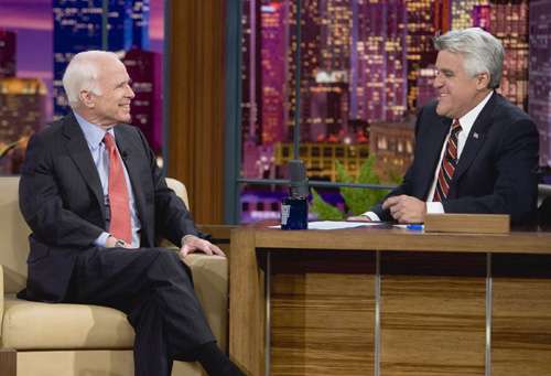 麥凱恩十一日在全國廣播公司的《今夜秀》(Tonight Show)中接受主持人積連奴訪問。他看來精神不錯,而且能夠泰然地拿敗選一事來開點玩笑。他說自己在敗選后一直“睡得像個嬰兒般:睡兩個鐘頭,然后起床哭一下,然后又睡兩個鐘頭。”麥凱恩稱,他所住的亞利桑那州現在已出了四名在大選中落敗的總統候選人,因此該州“可能是美國唯一一個母親們不會告訴子女他們有朝一日可以當上總統的州分了。”他又說,大選翌日他和妻子辛迪做的第一件事是出門買咖啡,而“不是買報紙”。