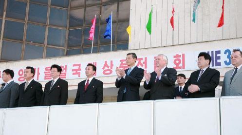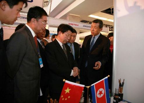 10月8日,第三屆平壤秋季國際商品展覽會舉行開幕式,左起第三為盧斗哲,第四為李龍男,第五為劉曉明。
