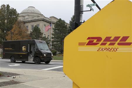 11月11日,美國維明頓,一輛UPS運送車駛過一個DHL投遞箱。