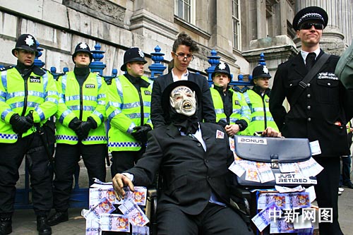 中新社倫敦四月一日電(記者 李鵬 張朔)二十國集團(G20)峰會舉行的前一天,成千上萬的示威者在倫敦四處抗議。全球經濟衰退因金融而起,倫敦金融城因此成為抗議活動的“主戰場”。