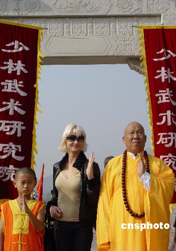 十月二十五日,俄羅斯美女體操明星霍爾金娜造訪嵩山少林寺。當日,以俄羅斯國家杜馬體育、運動和青年事務委員會副主席、中俄友好、和平與發展委員會俄方青年工作分委會副主席亞歷山德拉·布拉塔耶娃為團長的俄羅斯奧運冠軍代表團一行訪問嵩山少林寺。據悉,俄羅斯奧運冠軍代表團此次來訪是全國青聯為配合北京奧運會舉辦的體育交流項目,也是二00七年中俄友好、和平與發展委員會中俄雙方青年工作分委會框架內重點交流活動之一。中新社發 李志全 攝