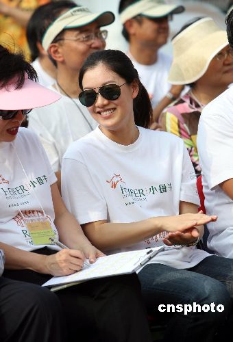 很少在香港公開場合露面的伏明霞,二十七日陪同丈夫梁錦松參加維園舉行的小母牛[競步善行]社會各界同心助國內農民脫貧慈善賽活動。
