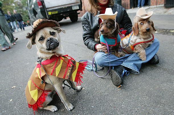 圖片十:在紐約城湯普金斯廣場公園舉行的規模最大的萬圣節小狗大游行中,三只小狗被打扮成牛仔的模樣,在人群中招搖過市。(鐘巖)