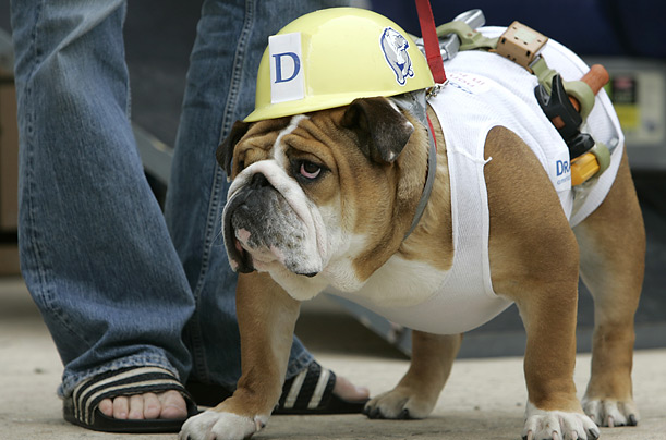 圖片十四:在美國衣阿華州得梅因年度最靚牛頭犬大賽上,波特豪斯頭戴鋼盔,身著工作服,打扮成一名建筑工人的模樣,閃亮登場。(鐘巖)