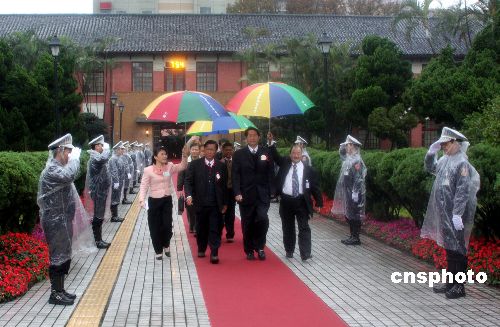 臺(tái)灣數(shù)十位腳登高筒皮靴的警官冒雨列隊(duì)在“立法院”內(nèi)紅地毯兩側(cè)迎接臺(tái)灣第七屆“立法委員”前來辦理報(bào)到并宣誓就職。