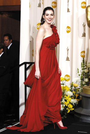 安妮·海瑟威 最典雅的紅色穿法。海瑟威一襲Marchesa禮裙讓人驚艷,從肩部到腰處斜斜地點綴著一道花束帶,加上裙擺上的皺褶,看上去如古希臘雕像般典雅美艷。