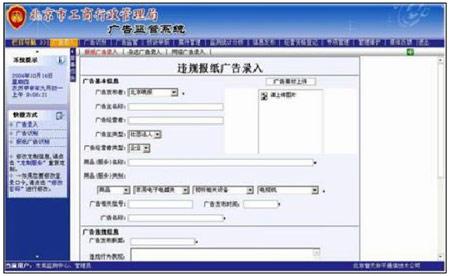 圖例為北京工商廣告監(jiān)管的電視廣告采集系統(tǒng)的登記界面、平面廣告采集系統(tǒng)的登記界面、廣告監(jiān)管系統(tǒng)的使用界面、以及統(tǒng)計(jì)分析的圖表等。