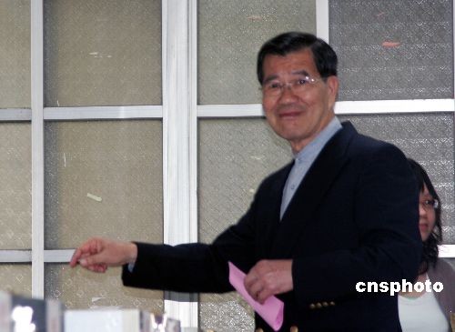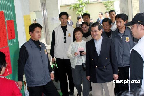 二00八臺灣地區領導人選舉投票三月二十二日舉行,中國國民黨候選人蕭萬長與夫人在臺北一個投票所投票。中新社發 黃少華 攝