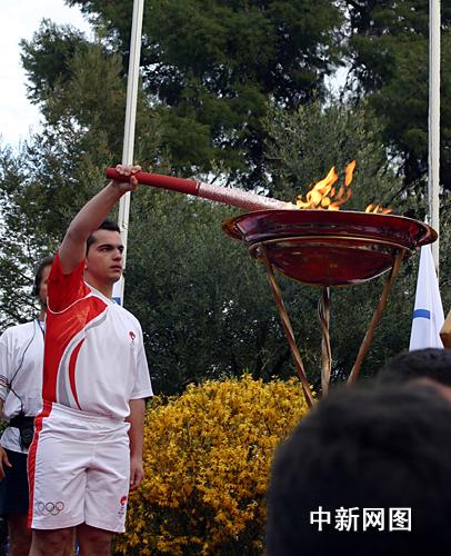 3月25日,北京2008年奧運圣火希臘傳遞第二天,慶典儀式在終點約阿尼納舉行。最后一棒火炬手點燃圣火盆,圣火將被盛放在圣火盆中在此停留一晚。 中新社記者 王歡