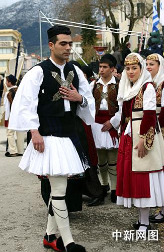 3月25日,北京2008年奧運(yùn)圣火希臘傳遞第二天,慶典儀式在終點(diǎn)約阿尼納舉行。圖為身著希臘民族傳統(tǒng)服裝的舞蹈演員。中新社記者 王歡