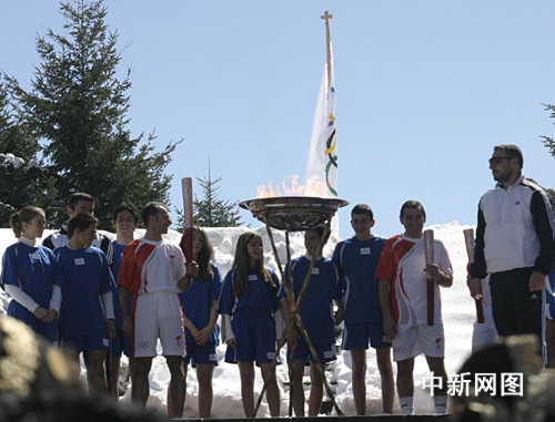 3月26日,北京奧運會圣火希臘境內傳遞第三日,抵達冰雪覆蓋的山城邁措翁。圣火在冰雪世界熊熊燃燒。中新社記者 王歡