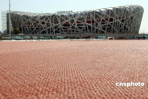 隨著北京奧運(yùn)會(huì)腳步的逐漸臨近,奧運(yùn)場館的建設(shè)也進(jìn)入了最后的收尾階段。3月下旬,國家體育場“鳥巢”旁的熱身場地塑膠跑道已基本鋪設(shè)完成。中新社發(fā) 富田 攝